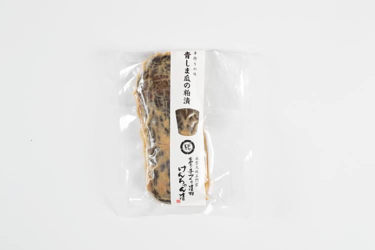 濃い緑色の縞模様の入った「青しま瓜」は全国でも珍しく、出雲地方では家庭の味として「青しま瓜の粕漬」が漬けられてきました。昔ながらに、塩漬けした瓜を1枚1枚天日に干して出雲杜氏の上質な酒粕で丁寧に漬けこみました。ポリっとした食感と芳醇な酒粕の風味が格別です。